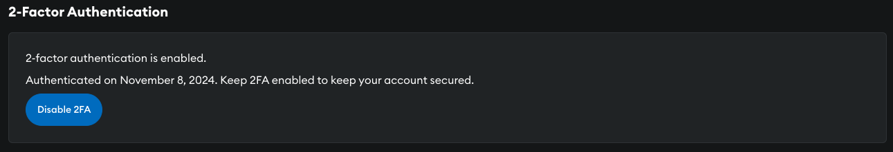 If you lose your 2FA device and must recover your account or log in using the backup code, then 2FA authentication is automatically disabled, and you must enable it again.